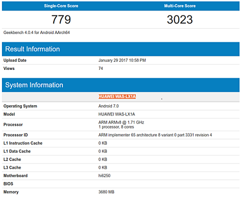 De acuerdo con nuevas filtraciones, se ha detectado un dispositivo Huawei llamado Huawei WAS-LX1A en Geekbench; este es un microteléfono que contará con un procesador Kirin 655 con 8 núcleos a 1.71GHz. Además dispondrá de una memoria RAM de 4GB. Y contará con Android 7.0 Nougat como sistema operativo. Aunque no hay confirmación, se dice que el teléfono en cuestión es el P10 Lite.